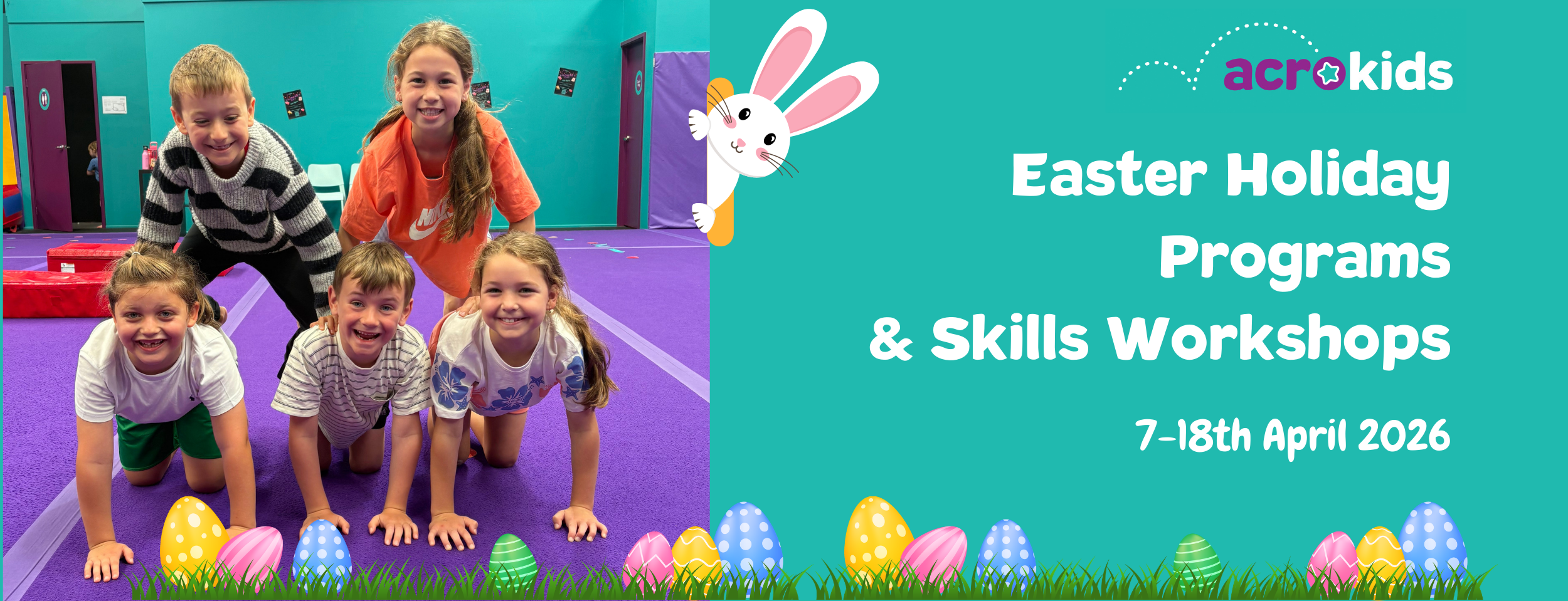 Get your kids into the action these easter holidays at Acro Kids! We’re the place to be with our super fun full day programs, specialised skills workshops and casual play at our Mornington and Braeside venues.